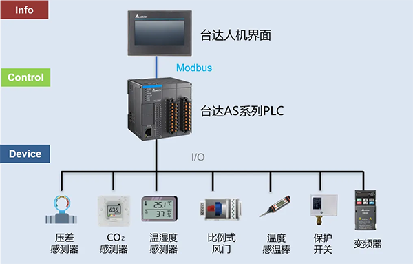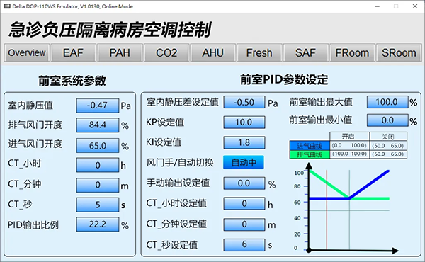 常见空调箱控制应用在商办大楼一般仅控制温度,CO2, 但在特殊冷房应用, 例如 : 医院隔离病房、手术室、电子厂无尘室,更要求正负压及温湿度控制。台达负压空调控制系统解决方案,通过PID优化,以Split Range Control 达到隔离房负压快速响应控制。另外,将此功能建立FB(功能块)可便捷应用在类似正负压控制。